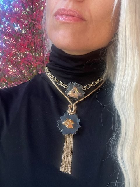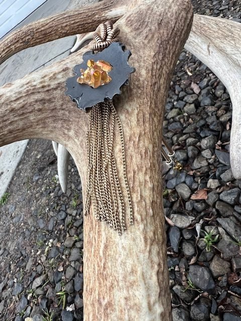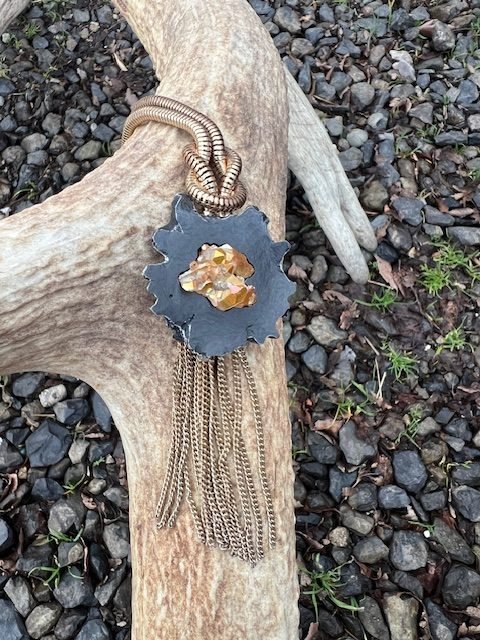 This elegant yet boldly expressive necklace centers on a luminous iridescent quartz cluster, alive with shifting flashes of color as it catches the light. The stone is set into a richly dyed black deer antler burl, where the organic curves and natural texture create a striking contrast against the crystal’s brilliance. A thick chain with gold accents adds weight and presence, elevating the piece with a touch of luxury while maintaining its wild, earthy soul. Both refined and unapologetically eye-catching, this necklace is designed to stand out—an adornment that balances raw nature with high-impact elegance.