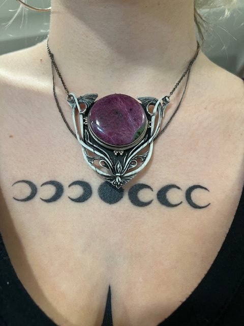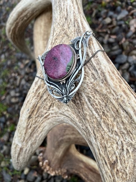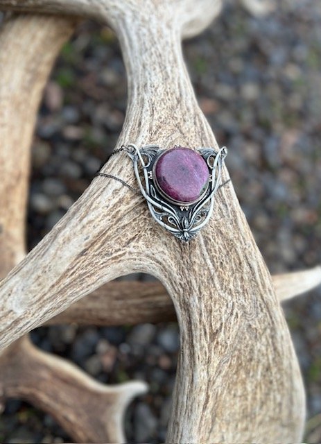 An elegant union of earth and refinement, this handcrafted amulet necklace is carved from naturally shed elk antler. At its center rests a striking rubellite cabochon, glowing with rich, romantic hues, set in sterling silver. The antler contrasts beautifully with the vibrant stone, creating a piece that feels both timeless and powerful. Designed as a wearable talisman, this necklace carries a quiet sense of grounding, artistry, and soulful luxury—an heirloom piece that tells a story of nature, craftsmanship, and intention.