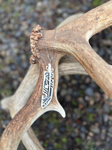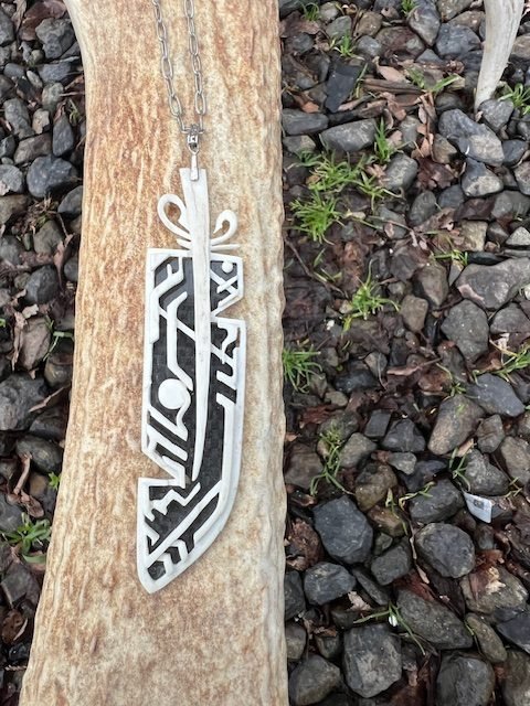 Carved by hand from naturally shed elk antler, this feather pendant feels as though it belongs to a bird from another world. Its elongated form and etched, alien-like symbols give the piece a sense of mystery—part talisman, part artifact—suggesting messages carried between realms. The warm, organic surface of the antler is backed with sleek carbon fiber, creating a striking contrast between ancient, earth-born material and modern, futuristic strength. Finished with a silver bale and chain, this pendant balances the wild and the otherworldly, offering a wearable symbol of curiosity, evolution, and the unseen paths that connect worlds.