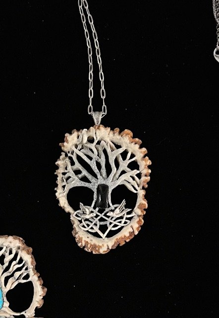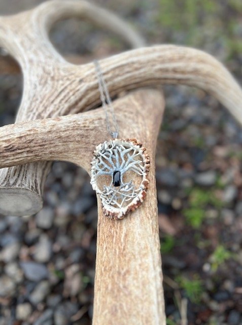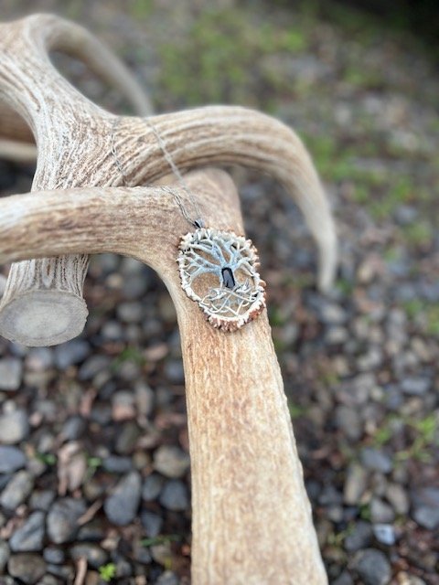Hand-carved from naturally shed elk antler, this Tree of Life pendant is a quiet study in symbolism and craft. Flowing branches and roots emerge from the organic surface, representing connection, renewal, and the balance between earth and spirit. Set at the center, an onyx cabochon draws the eye with its deep, velvety black, creating a powerful contrast with the antler. The result is a grounded yet elegant pieceāan intentional talisman that carries the strength of the wild and the timeless meaning of the Tree of Life.